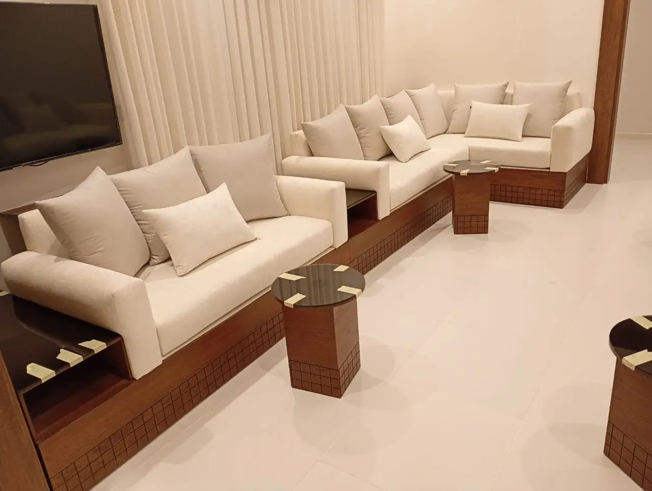 - التصميم حسب الطلب: نتيح لعملائنا إمكانية تصميم الجلسات وفقًا لرغباتهم من حيث المقاسات، وعدد القطع، وشكل الزوايا كي تناسب مساحة الصالة وطبيعة الاستخدام والذوق الشخصي، باستخدام شغل الاسبرينج مع المطاط الألماني لضمان مرونة أعلى.
